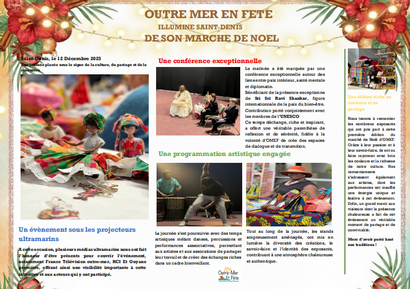 Le 12 décembre, l’association Outre-Mer en Fête (OMEF) a organisé la première édition du Marché de Noël des Outre-Mer à la Bourse du Travail de Saint-Denis, une journée placée sous le signe de la culture, du partage et de la rencontre.